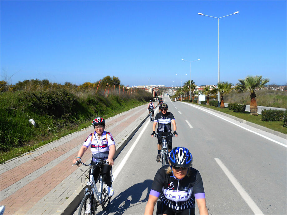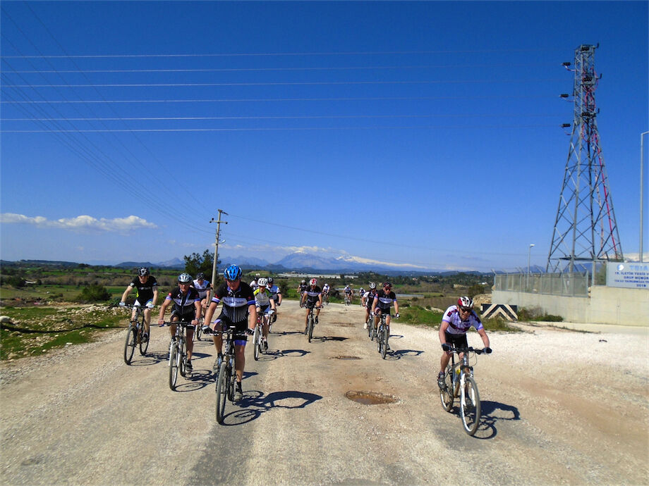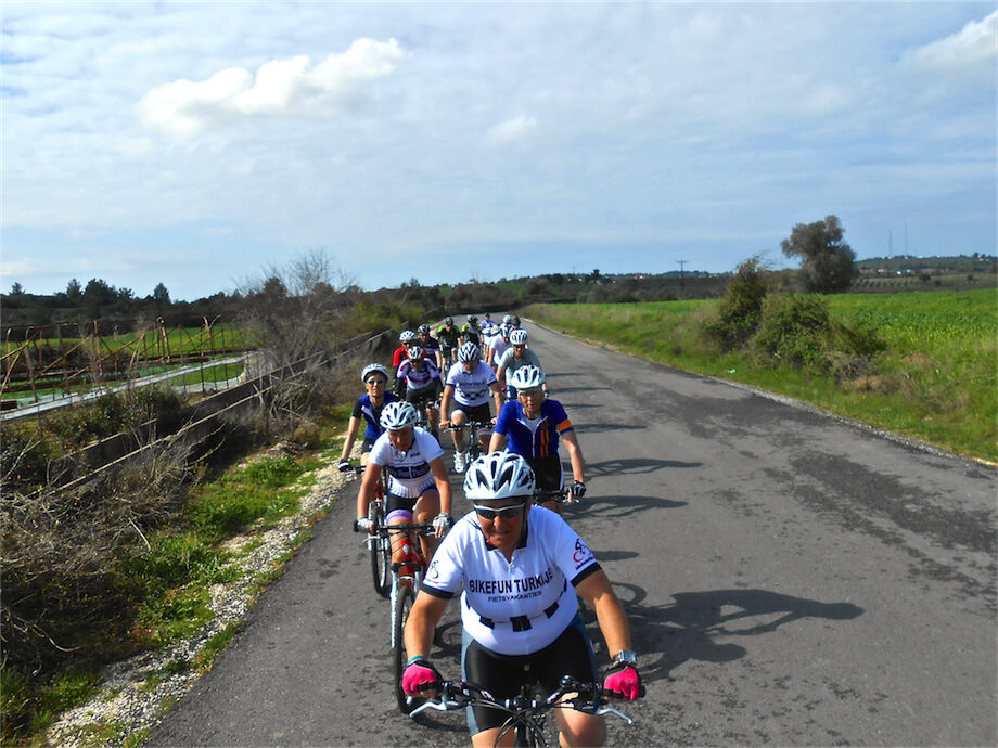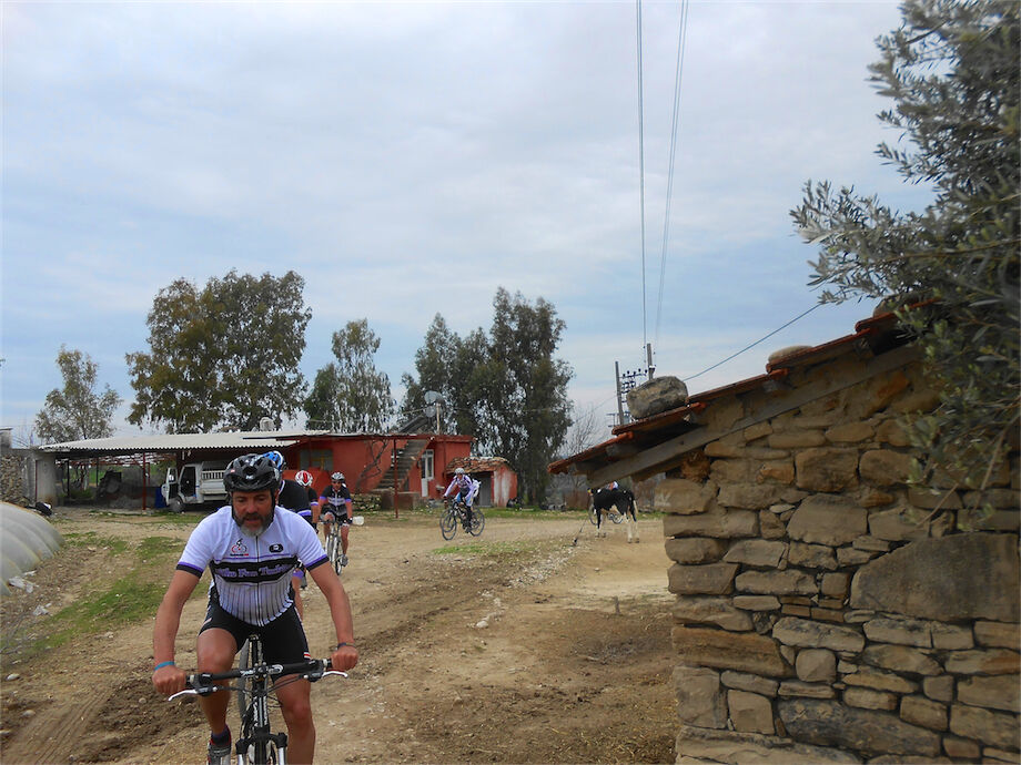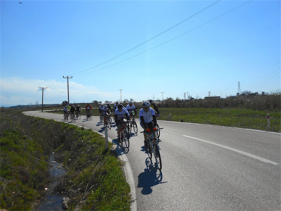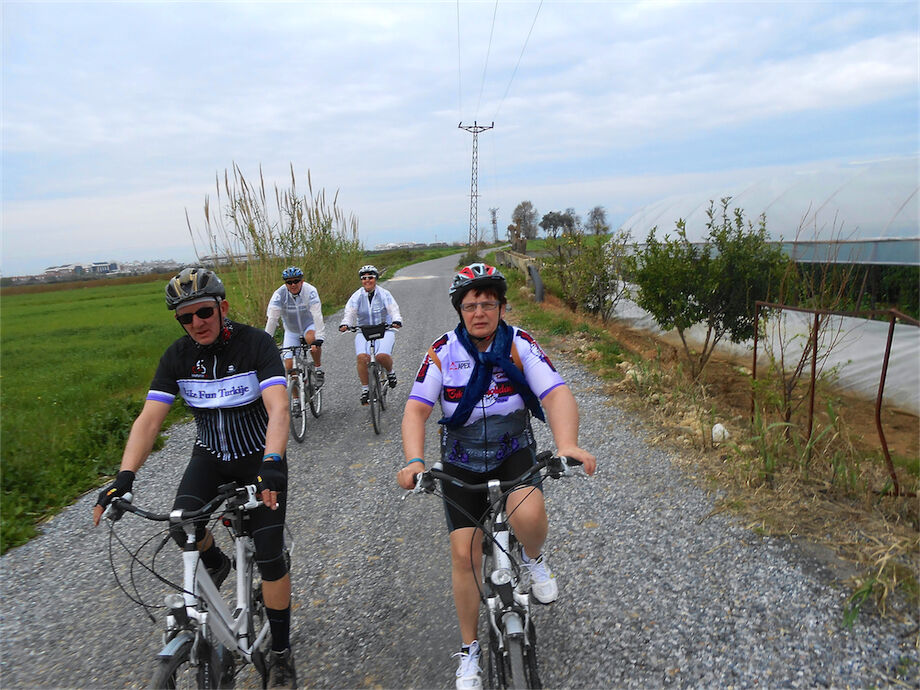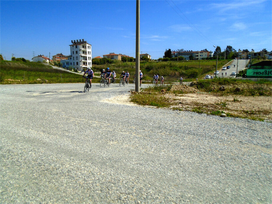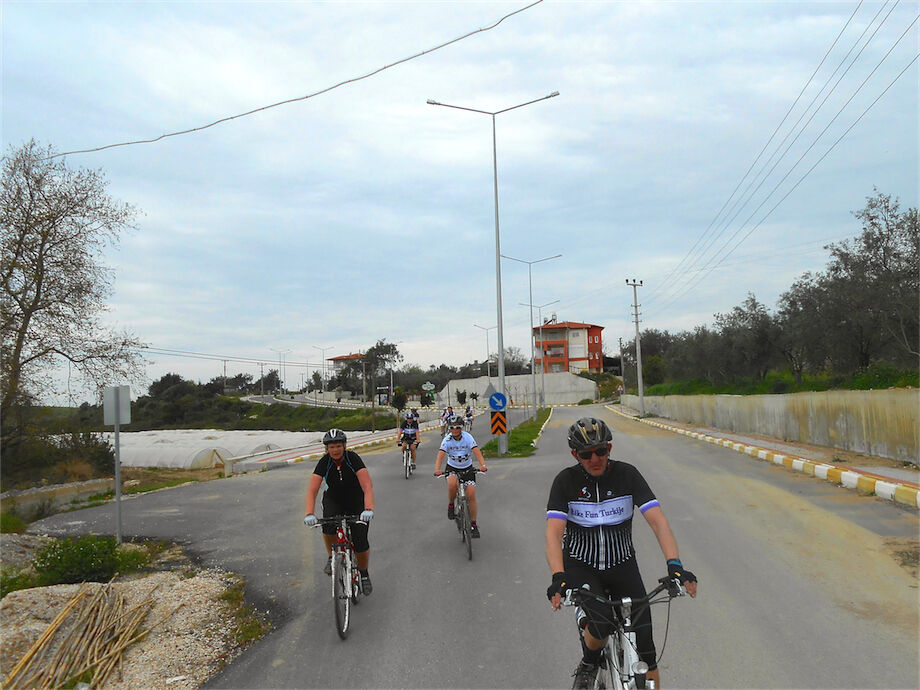 Zon en bewolking. Met 2 groepen gefietst. Een groep geplande tocht langs Aspendos gedaan. 66 km. Andere groep door zware bewolking op hun route een nieuwe tocht gedaan met nieuwe off-road wegen. 73 km