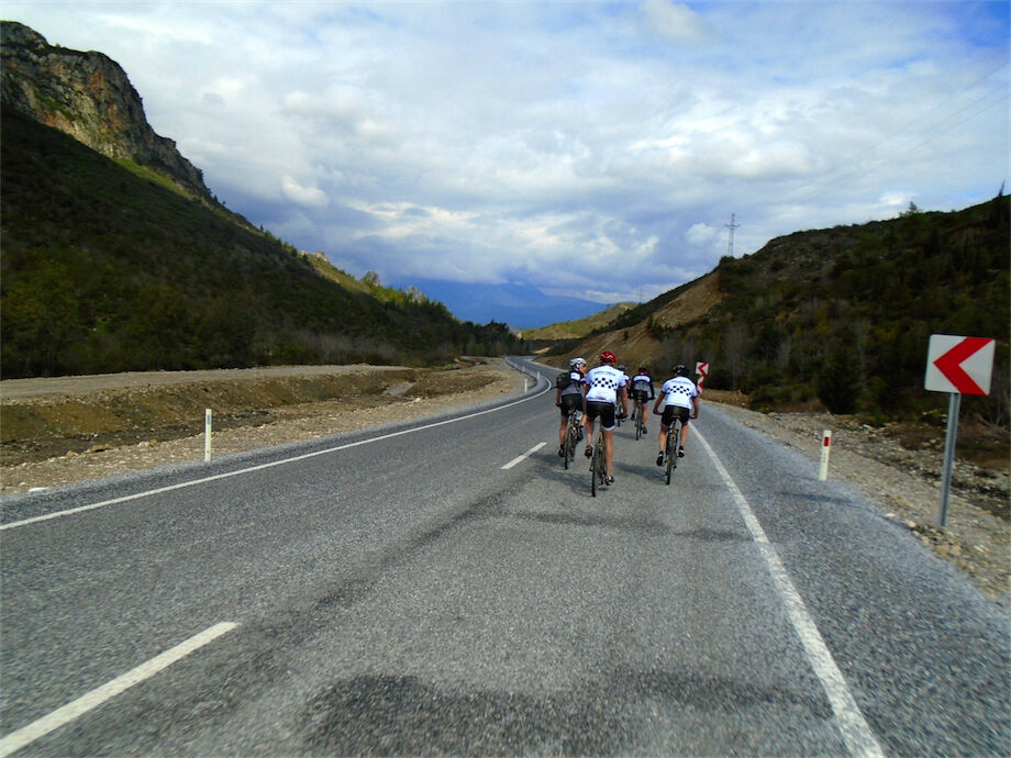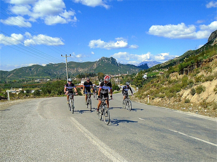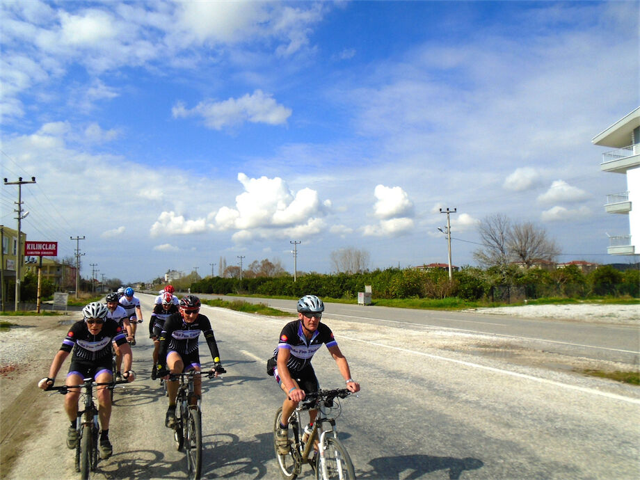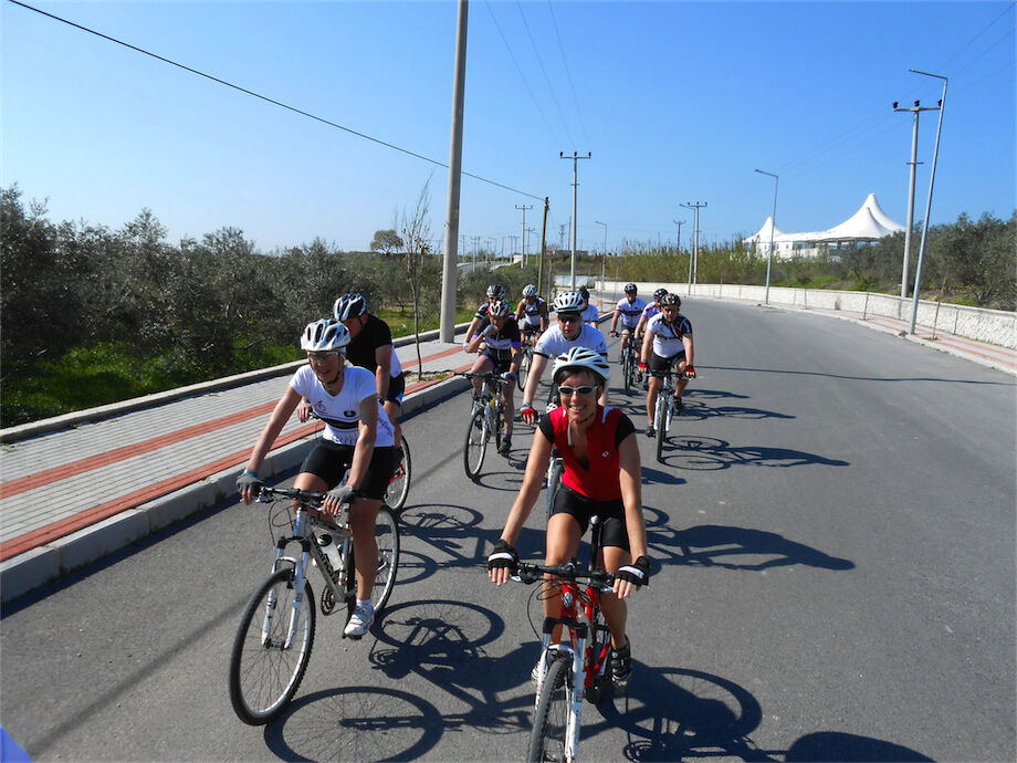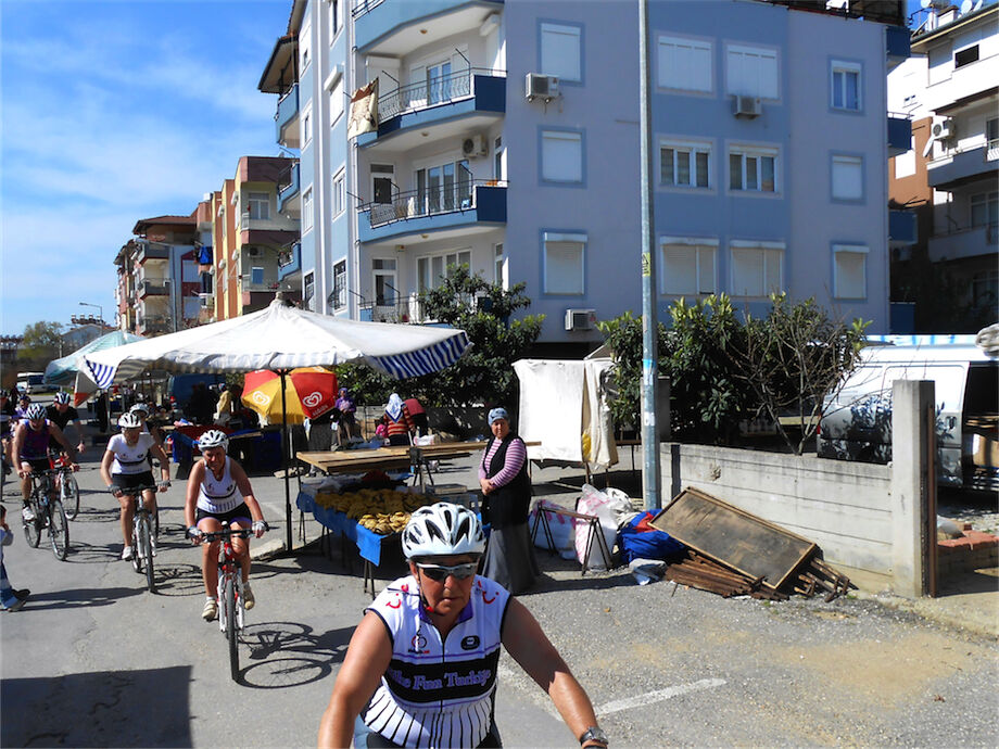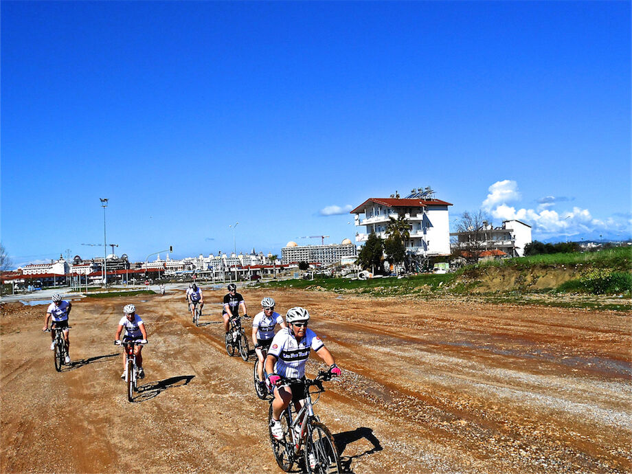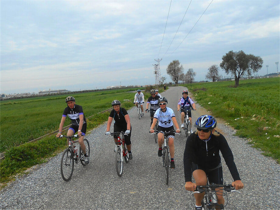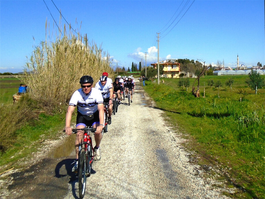 Zon en bewolking. Met 2 groepen gefietst. Een groep geplande tocht langs Aspendos gedaan. 66 km. Andere groep door zware bewolking op hun route een nieuwe tocht gedaan met nieuwe off-road wegen. 73 km