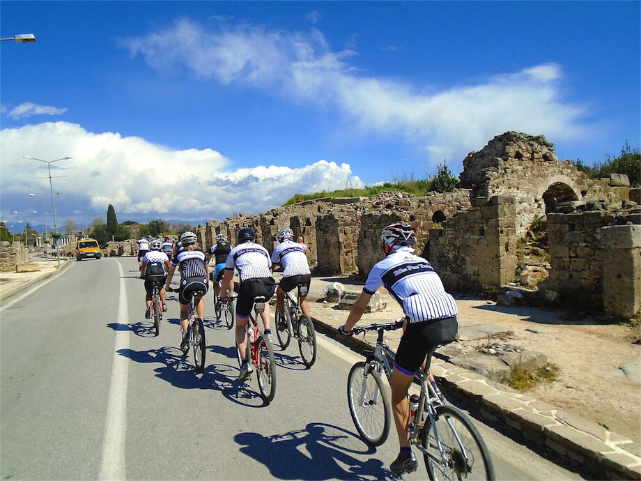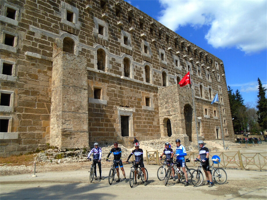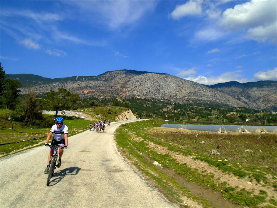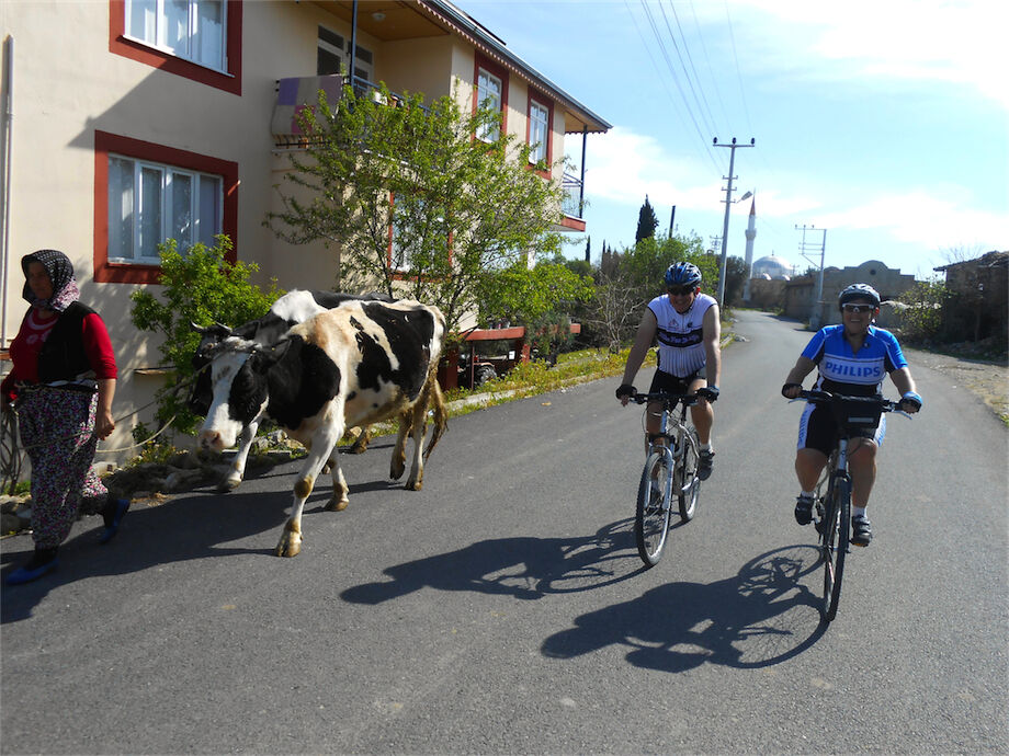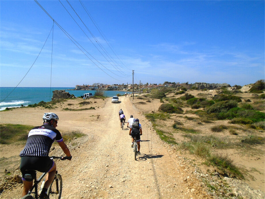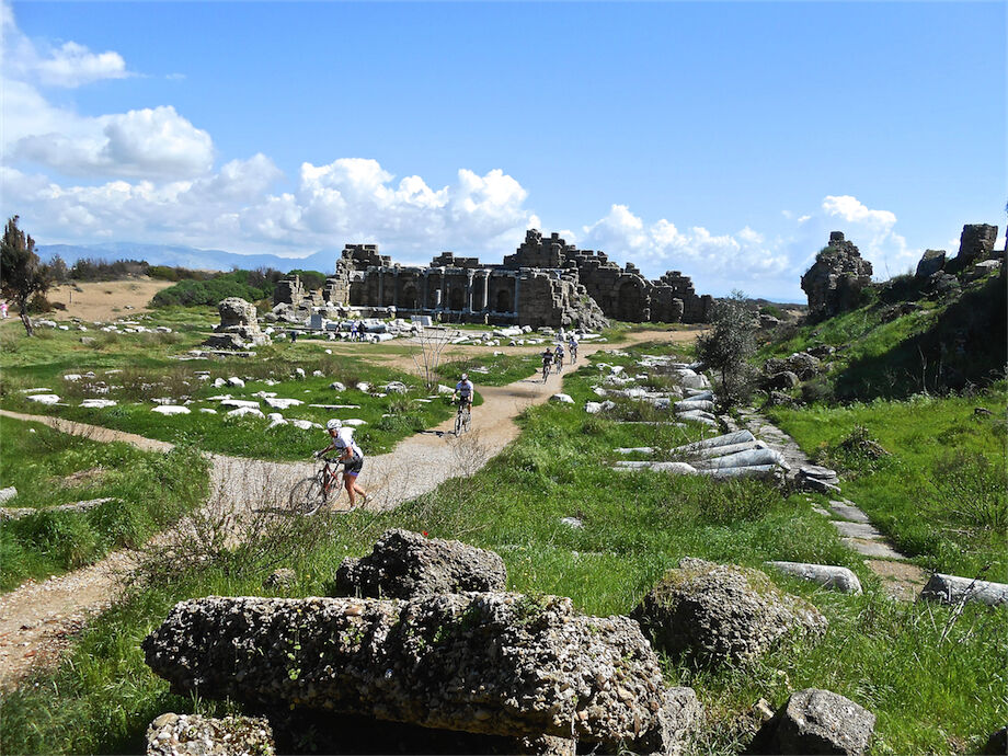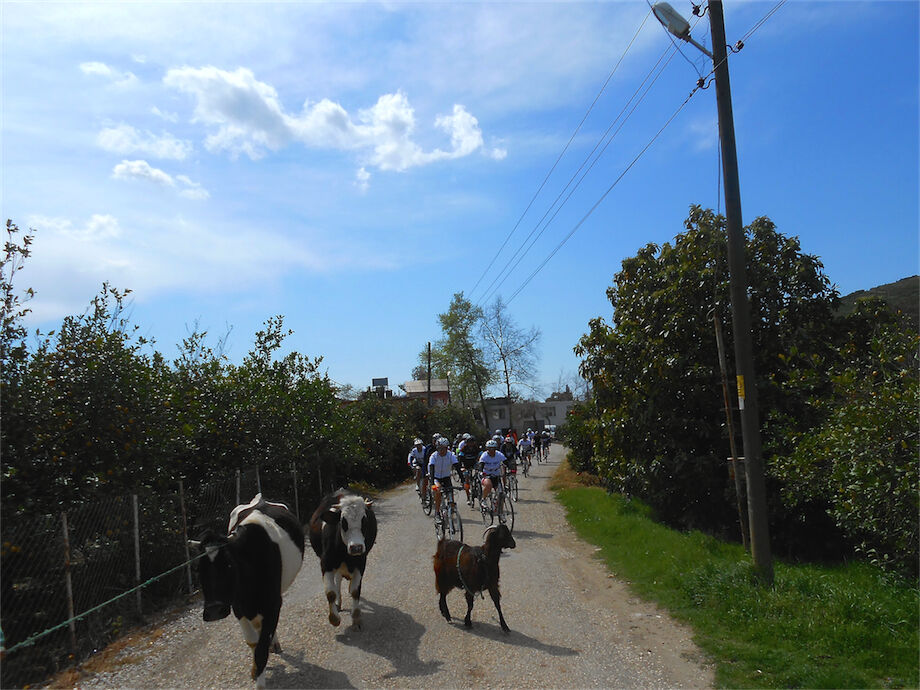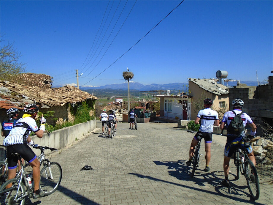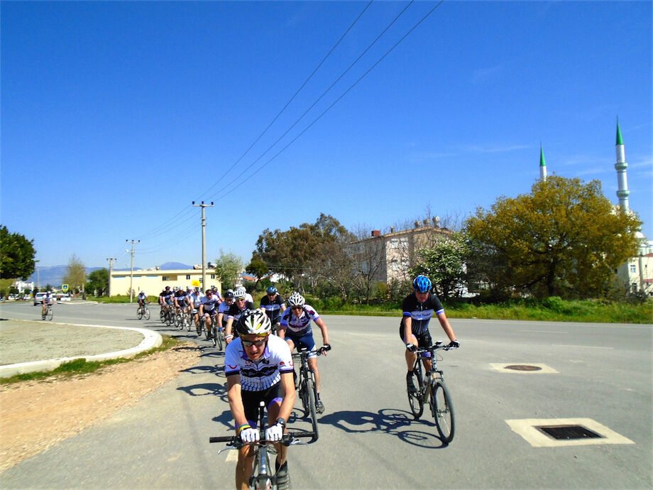 Zon en bewolking. Met 2 groepen gefietst. Een groep geplande tocht langs Aspendos gedaan. 66 km. Andere groep door zware bewolking op hun route een nieuwe tocht gedaan met nieuwe off-road wegen. 73 km