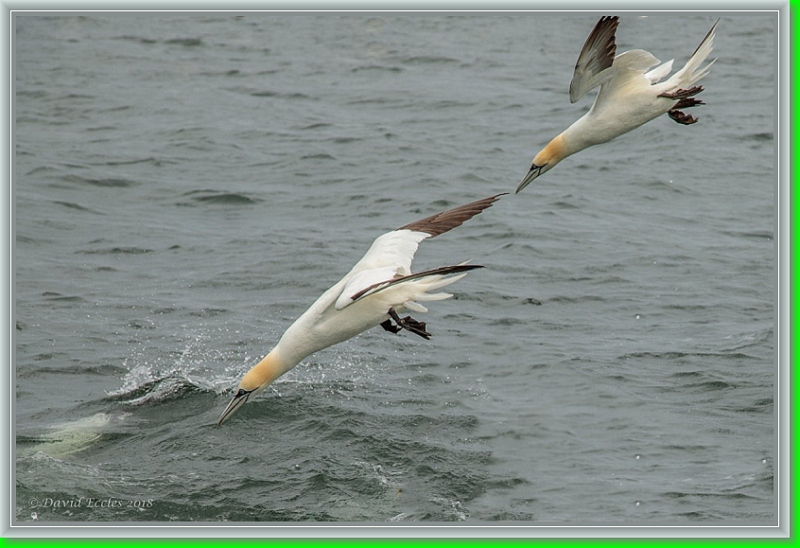 De Jan-van-Gent presteert iets gelijkaardigs om zich als een speer in de zee te boren. Hij laat zich vanop grote hoogte in het water storten, om een prooi onder het wateroppervlak te vangen en zich vervolgens te draaien en weer naar boven te zwemmen. De noordelijke Jan-van-Gent klimt tot wel 40 m hoog in de lucht en bereikt bijna 100 km / u wanneer hij door het wateroppervlak klieft. Dankzij die snelheid duikt hij wel tot 35 m diep om daar een sappige sardine uit het water te plukken. De vogels houden hun vleugels tijdens hun duikvlucht gespreid om ze pas in de laatste sec dicht tegen hun lijf te klemmen. Zo verliezen ze amper snelheid wanneer ze het water raken. Jan-van-Genten zijn perfect uitgerust voor deze uitzonderlijke duiktechniek. Ze ademen via dunne spleten in hun bovenkaak die sluiten wanneer de vogel duikt; hun schedel is verstevigd en in hun borst zitten luchtkussens die dienen als airbag. Het stuntwerk van de slechtvalk en de Jan-van-Gent is levensgevaarlijk. Allebei lopen ze het risico om hun nek te breken. Maar dat risico nemen ze, anders zouden ze verhongeren.