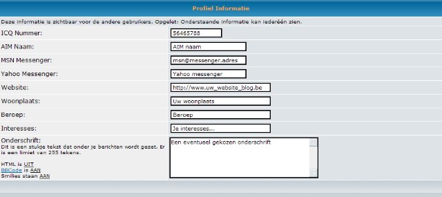 zijn, enz. Kijk het goed na dat er geen typfout instaat. Verder worden er nog een aantal gegevens gevraagd. Deze zijn niet verplicht in te vullen. Het gaat over ICQ, AIM, enz. als dit u niets zegt, vul dan niets in.