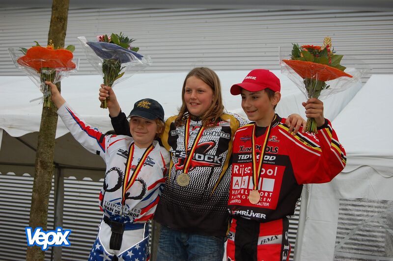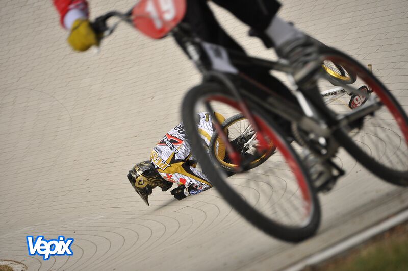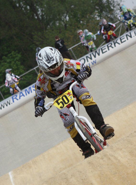 Yenten had in zijn eerste reeks al pech... een thuisrijder (die vlak naast Yenten in de start stond) vond het nodig om op de startberg plotseling volledig naar binnen te gaan... Yenten kennende, laat hij dit niet zomaar gebeuren... schrik heeft hij niet, dus zal hij zeker niet in de remmen gaan... bij hem is het alles of niets, en het werd niets beiden smakten op de startberg tegen de grond... Yenten raapte vlug zijn BMX op, reed zijn reeks verder en eindigde nog als 6e! Toch moest hij even de eerste hulp post binnen voor verzorging... elleboog lag volledig open (met wat ontsmetting en verzorging was dit vlug verholpen) maar zijn vingers baarde ons meer zorgen want daar had hij ongelooflijk veel pijn in! Yenten was boos, teleurgesteld, ... en toonde toen zijn karakter... hij raakte net op tijd klaar voor de volgende reeks en hij was uit op sportieve revanche... hij toonde zich sterk en haalde in zijn volgende reeksen telkens nog een 3e plaats... zo kon hij mee naar de 1/4 finale! Hij had in zijn reeksen al zoveel kracht moeten gebruiken om toch nog naar deze 1/4 finale te kunnen doorstoten dat hij hier nu kracht te kort kwam en zich net niet meer kon plaatsen voor de 1/2 finale... toch zijn we weer super trots op hem... en heeft hij getoond wie Yenten eigenlijk is! Voorlopig staat hij in het klassement op een mooie 18e plaats van de in totaal 70 deelnemers in zijn leeftijds categorie Boys 10;-)