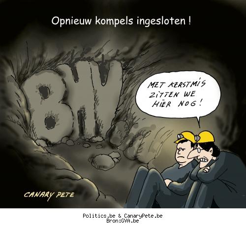 Komen drie Belgen voor een solicitatiegesprek voor een baan in de mijnen. De 1e loopt naar binnen. Daar zegt de Directeur van het geheel: "Eerst moet je een paar vragen beantwoorden alvorens je aangenomen wordt. Vraag 1: Heb je ervaring in de mijnbouw?" "Ja," zegt de 1e Belg. "Waar heb je gezeten dan?" "In Amsterdam," zegt de Belg. "Wegwezen," zegt de Directeur, "in Amsterdam zijn geen mijnen." Komt de 2e Belg binnen: "Heb je ervaring?" "Ja," zegt die Belg, "ik zat in Limburg." "Goed," zegt de directeur, "op welke diepte heb je gewerkt?" Belg: "Op een meter of drie vier." Ook deze Belg kon weer vertrekken. De laatste Belg stapt naar binnen. Directeur: "Heb je ervaring met dit werk?" Belg: "Ja, ik heb in Limburg gewerkt." Directeur: "Op welke diepte?" Belg: "Metertje of 500 tot 1000." Directeur: "Mooi, goed. Dan heb ik nu nog een vraag: Die lampjes bovenop de helm, werken die op gas of was dat een lamp met een batterijtje?" Belg: "Die lampjes had ik niet nodig, ik werkte in de dagploeg."
