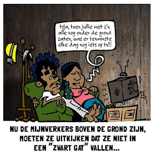 De 33 mijnwerkers hebben na 69 dagen in de darkroom eindelijk hun coming-out. De 33 geredde goudmijnwerkers kwamen er opmerkelijk gezond uit. Slechts een enkeling had last van goudkoorts.