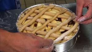 Rol het resterende deeg uit tot een lap en snijd hier dunne reepjes van. Bedek de taartvulling kruislings met de reepjes deeg en druk de randen dicht. Bestrijk met het resterende losgeklopte ei de bovenkant van de taart.
