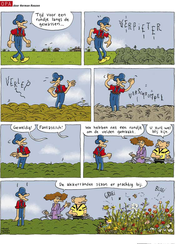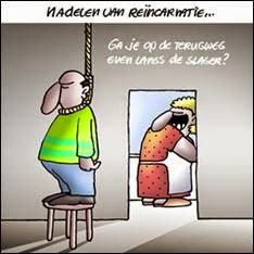 Een man ligt op zijn sterfbed en zijn zoon zit wakend naast hem. De geur van verse warme appeltaart streelt de neus van de man en hij vraagt aan zijn zoon: ''Jongen, wilt ge me een stukje taart halen uit de keuken?'' Even later staat de jongen met lege handen weer aan het bed, waarop de vader: ''Wel?'' Zegt de jongen: ''Mama zegt dat de taart voor na de begrafenis is.''