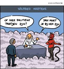 Een man ruilt het tijdelijke met het eeuwige na meer dan een halve eeuw verbonden te zijn geweest in een duurzaam en vrij gelukkig huwelijk. Niet zo lang daarna overlijdt ook zijn vrouw. Als ze haar man in het hiernamaals aantreft vliegt ze hem in de armen en roept: "Liefste, wat een geluk je hier te vinden". De man kijkt verbijsterd op en zegt: "Nee hé... Niet nog eens...... De afspraak was 'tot de dood ons scheidt'".