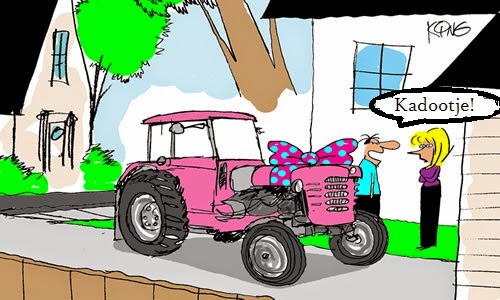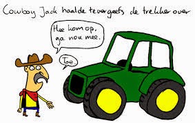 Komt een man bij een boerderij, belt aan en er doet een klein jochie open. De man vraagt of zijn vader thuis is, waarop het jochie antwoordt: "Nee, is overreden door een tractor." De man vraagt vervolgens of zijn moeder misschien thuis is. "Nee, is overreden door een tractor." "Zijn je opa of oma dan thuis?" Zegt het jochie: "Nee, zijn overreden door een tractor." "Maar", zegt de man, "wat doe je dan zo al overdag?" Jochie: "Tractor rijden!"