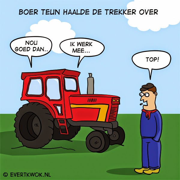 Twee boeren zijn tegen elkaar aan het opscheppen. zegt de ene boer tegen de andere boer: "Als ik met mijn tractor om mijn akker heen moet rijden dan ben ik twee dagen aan het rijden." Zegt de andere boer: "Ja zo'n tractor heb ik ook gehad."