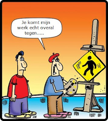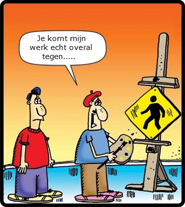 De ene vriend vraagt aan de andere: ,,Waarom zetten schilders altijd hun naam onder een schilderij, Tom?" "Nou.... dan weten ze tenminste wat onder en wat boven is, Bart´´