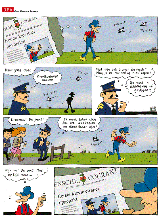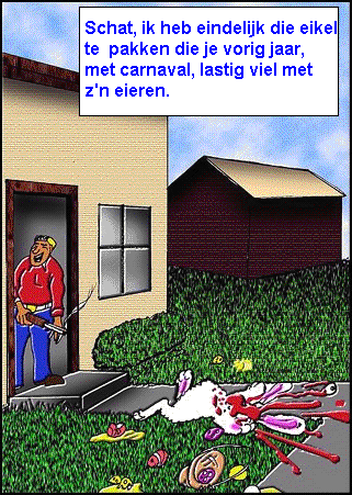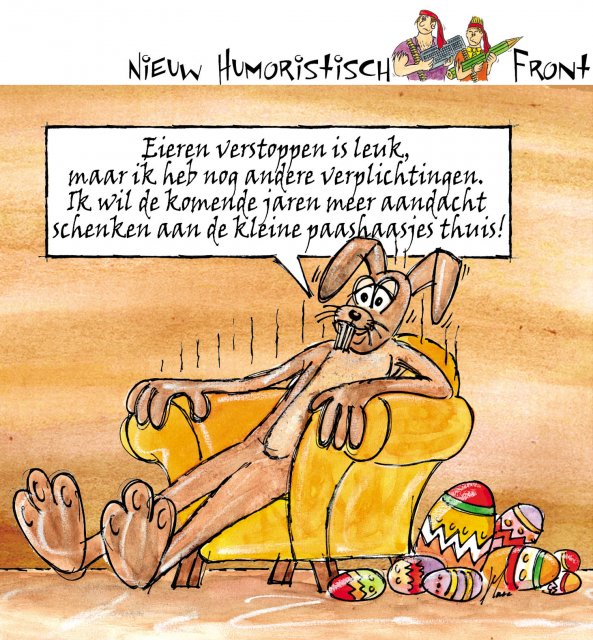 De paashaas komt in het kippenhok en duwt een gigantisch beschilderd struisvogelei voor zich uit. Goedemorgen dames," zegt hij tegen de kippen, "ik wil niet drammen hoor, maar ik wou jullie toch eens laten zien wat men elders zoal presteert."