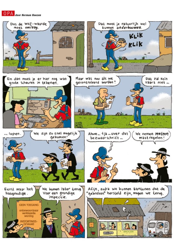 Een vrouw zegt tegen haar man voordat hij naar zijn werk gaat: Mijn nachtlampje doet het niet. Zou jij daar straks even naar willen kijken? Geïrriteerd wijst de man naar zijn voorhoofd en zegt: Staat hier soms elektriciën? Nee toch?! Als de man s avonds weer thuis komt zegt de vrouw tegen haar man: Heb je gezien dat het tuinhekje niet goed opengaat? Kun je daar zo even naar kijken? Weer wijst de man geïrriteerd naar zijn voorhoofd: Staat hier soms timmerman? Nee toch?!De volgende ochtend lekt de kraan in de badkamer. Wederom vraagt de vrouw aan haar man om daar even naar te kijken. Opnieuw wijst de man geïrriteerd naar zijn voorhoofd. Staat hier soms loodgieter? Nee toch?!Als de man s avonds thuis komt doet het tuinhekje het weer prima. Als hij zich gaat wassen blijkt dat de kraan ook niet meer lekt. En wanneer hij naar bed gaat knipt zijn vrouw demonstratief het nachtlampje aan. Heb jij dat allemaal zelf gemaakt?, vraagt de man verbaasd. Nee, zegt de vrouw, ik heb gevraagd of de buurman het wilde doen. Dat wilde hij wel, maar dan moest ik een taart voor hem bakken of een nummertje met hem maken. En .heb je een taart voor hem gebakken? vraagt de man. Geïrriteerd wijst de vrouw naar haar voorhoofd en zegt: Staat er soms bakker op MIJN voorhoofd?