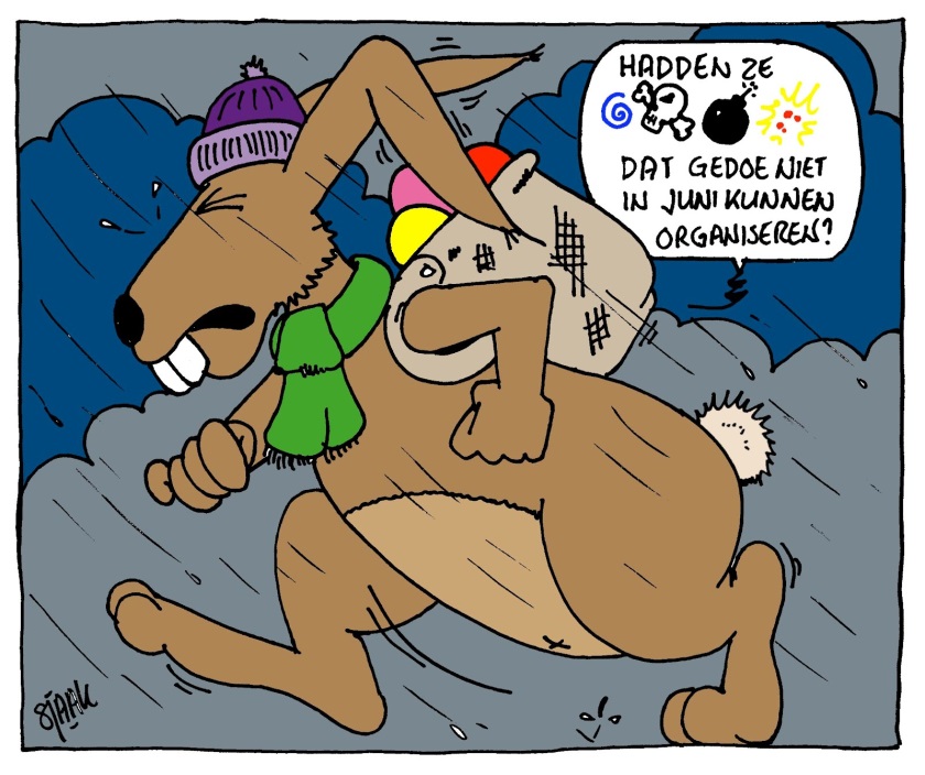 De paashaas komt in het kippenhok en duwt een gigantisch beschilderd struisvogelei voor zich uit. Goedemorgen dames," zegt hij tegen de kippen, "ik wil niet drammen hoor, maar ik wou jullie toch eens laten zien wat men elders zoal presteert."