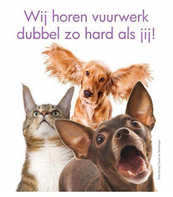 En wat te denken van de miljoenen huisdieren die bij de mensen wonen, honden, katten, konijnen, enz. enz., die bang zijn van vuurwerk. Een spuitje tegen de angst halen bij de dierenarts maakt het dier wel rustiger, want het is een 'slaapmiddel', het haalt niet de angst weg bij het dier.Wees daarom wijzer: Houdt u van dieren? Haal dan geen vuurwerk in huis!