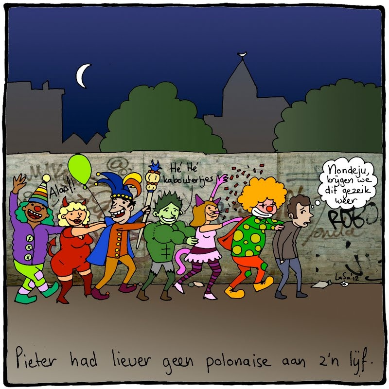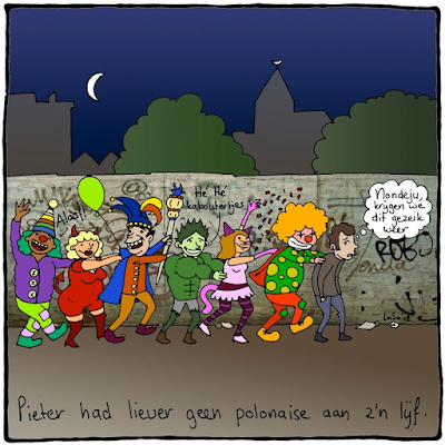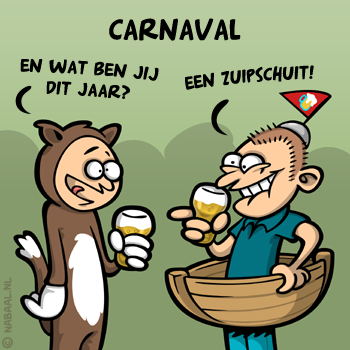Twee mannen lopen in carnavalsnacht over straat, zegt de een tegen de ander: 'mag ik in het midden lopen?'