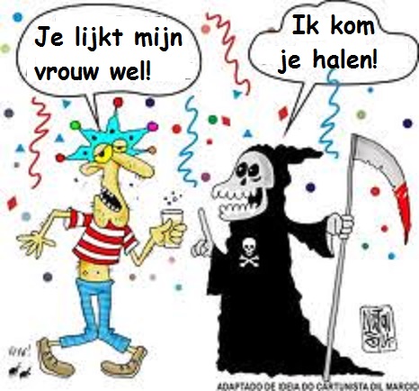 Een vrouw was het helemaal beu dat haar man tijdens de carnaval telkens dronken thuis kwam. Ze besloot hem eens een lesje te leren en hem de stuipen op het lijf te jagen..... in de hoop dat hij tot inkeer zou komen. Op een avond trok ze een duivelskostuum aan en verstopte zich achter een boom. Toen haar man voorbij wankelde, sprong ze tevoorschijn en bleef met haar rode horens, drietand en lange staart dreigend voor hem staan. 'W-wie ben jij?' vroeg de man stomdronken met dubbele tong.