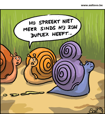 Twee slakken waren op stap en één slak wilde de straat oversteken. Zegt de andere slak: "Ben je gek, over een uur komt de bus."