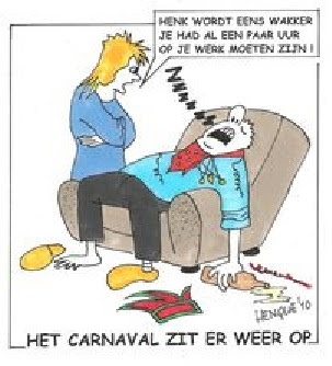Tijdens carnaval rijdt een man slingerend over de weg en wordt aangehouden door een agent. De agent komt naast de auto staan en vraagt waar hij geweest is."We zijn in een paar cafe's geweest" antwoord de man. "Juist ja," antwoord de agent en vouwt zijn armen over elkaar, "Nu is het zo; Ik volg u nu al een tijdje en merkte op dat twee kruisingen terug uw vrouw uit de auto is gevallen." zegt de agent."GOD ZIJ DANK" antwoordt de man. "IK DACHT AL DAT IK DOOF WAS GEWORDEN...