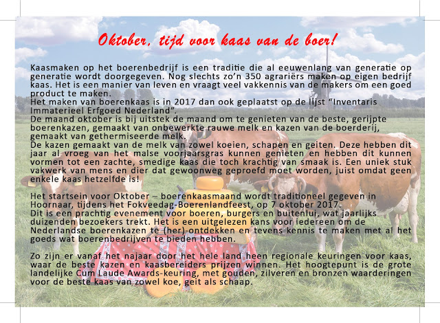 "In oktober zal extra promotie voor boerenkaas plaatsvinden", zegt Johan Noordam, voorzitter van de kaascommissie. Daar is wat hem betreft alle reden toe. "Kaas die ambachtelijk is gemaakt op de boerderij, heeft een eigen smaak, een eigen karakter. En is daarom veel lekkerder dan fabriekskaas, die doorgaans vlakker is."