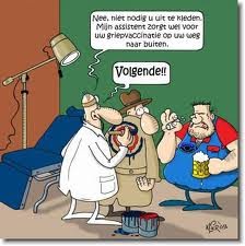 Onze Jef heeft het zwaar te verduren GRIEP De dokter komt bij hem en zegt Ja meneer u heeft het goed zitten, ik zal u iets voorschrijven om eens goed te zweten, waarop de dokter zijn hoed neemt en de kamer wil verlaten. En Jef roept : Ja Maar dokter, U zou mij toch nog iets voorschrijven om eens goed te zweten!. Waarop de dokter antwoordt: Dat komt morgen meneer, dan ontvangt u mijn rekeningetje .