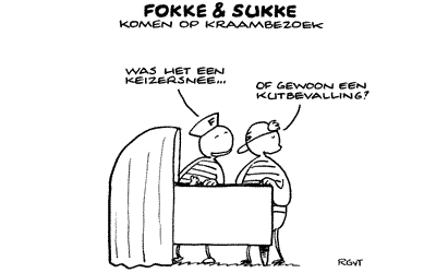 6. (Het hoofdje staat en er komt een volle bos met haar tevoorschijn.) Zo, die heeft zwart haar. Weet je zeker dat dit kind van mij is schat?