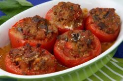 gehakt. Vul de tomaten met het gehakt en zet er het kapje weer op.