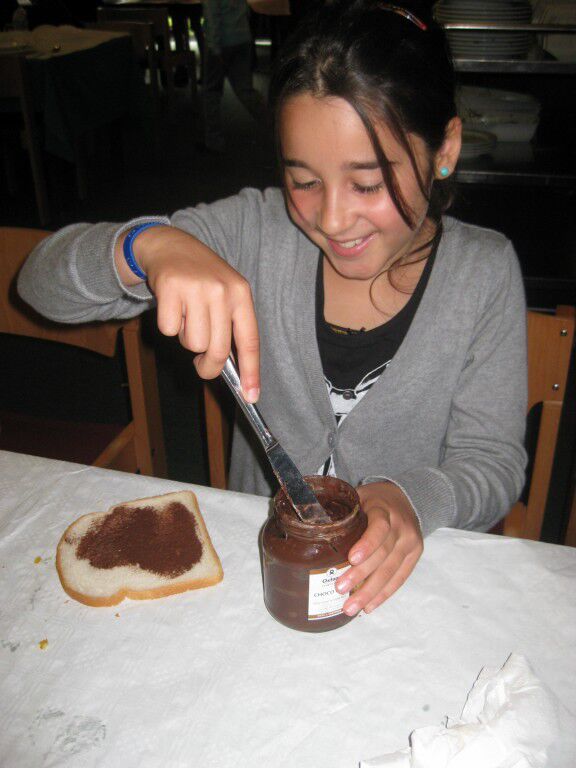 We smeerden lekkere Oxfam choco , een eerlijk product dat ook de kinderen in West-Afrika uit de kinderslavernij van de cacaoplantages kunnen gehaald worden .