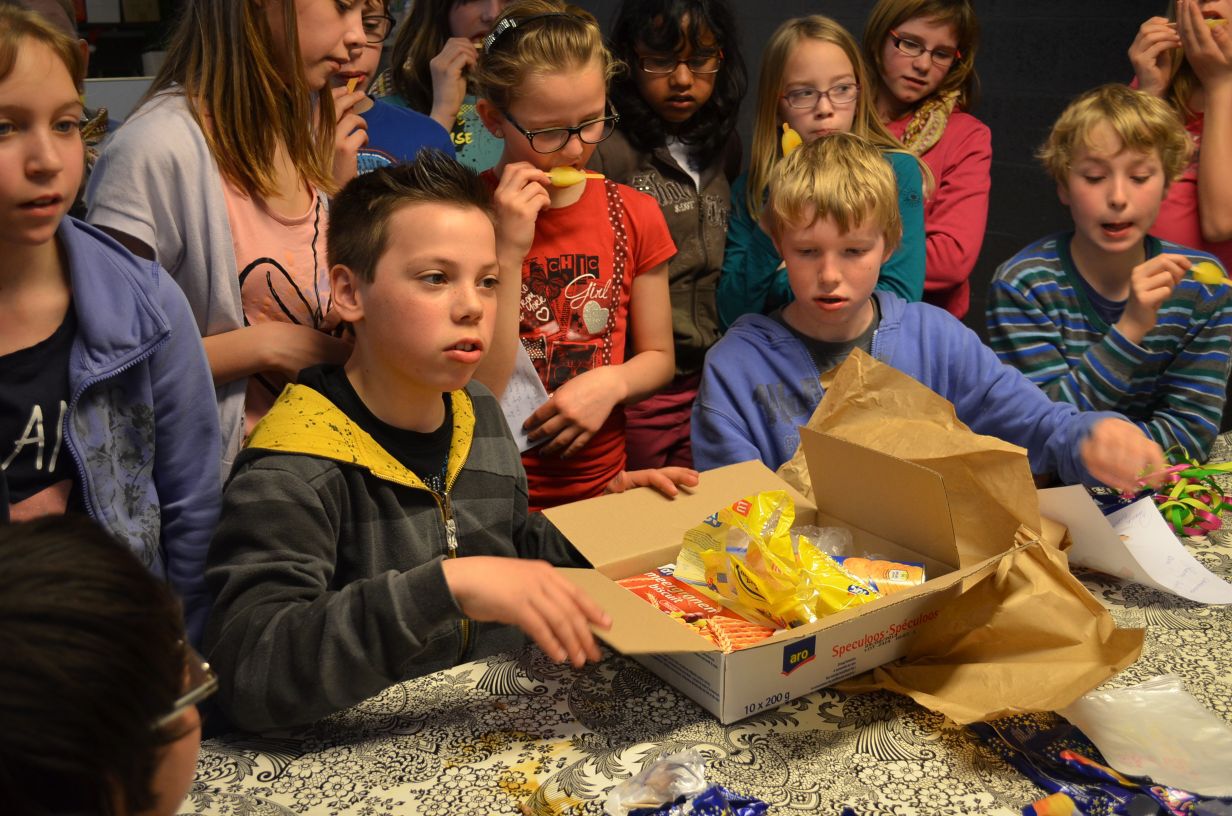 Juf Drieke werd vanmorgen gewekt door 36 leerlingen en 3 leerkrachten met een hoedje op hun hoofd. Ze werd vandaag erg oud!! Na de ochtendgymnastiek en een stevig ontbijt daagde jonkvrouw Salmonella de ridders met hun knechten uit in een vier-groepen-tornooi. Het werd een spannende strijd vol denk- en puzzelwerk, sport en spel. De beste groep won (zie foto). Na de everzwijnenballetjes trokken we het bos in om een heus kamp te bouwen. Daar verborgen wij onze schatkistjes. Bij het veroveren van elkaars schatten viel de ene al meer over een boomstronk dan de andere. Vanavond gaan we prachtige kunstwerken maken en kunnen de kinderen genieten van stromend water. Onze spaghetti komt er aan, dus "adios" en "tot morgen".