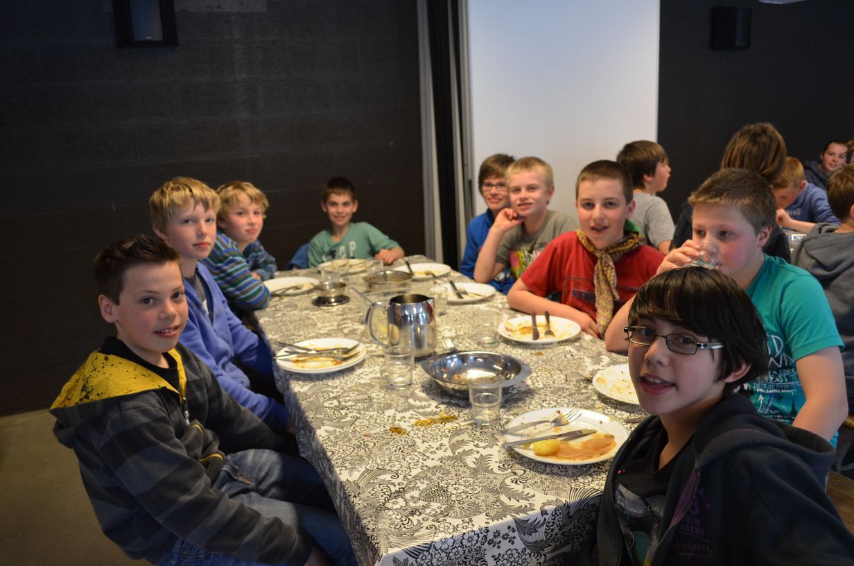We begonnen de dag met een mooi zonnetje. Na het ontbijt kregen de leerlingen het derde toneeltje te zien waarin jonkvrouw Salmonella de ridders uitdaagde tot een sportief duel. Jammer genoeg moesten we daarna afscheid nemen van ridder Ouderdomus. Meester Luc, bedankt voor de toffe dagen!!!!! We zullen je zaklamp missen... Daarna gingen we onze BB's (beruchte buren) bezoeken. We gingen te voet naar de Hare Krisna. Deze middag konden we genieten van heerlijke frietjes met stoofvlees. Nadat we ons buikje hadden rond gegeten, konden de leerlingen niet snel genoeg hun kajak-kleren aandoen. De zon straalde ons al tegemoet! Een aantal bootjes wiebelden gevaarlijk, andere bootjes slikten nogal wat water in, sommigen gingen zelfs kopje onder... maar uiteindelijk bereikte iedereen de eindmeet (al lag die van sommigen precies wat verder). De leerlingen konden na het kajakken genieten van een warme douche. Wij laten jullie vlug, want de maagjes beginnen te knorren.