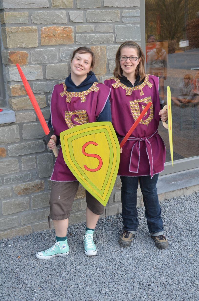 Ondertussen zijn we al enkele uren GOED aangekomen in Durbuy en ja... we hebben de zon al VEEL gezien. De busreis verliep vlot, het installeren ook, behalve het hoeslaken over die matras krijgen... Mama's, dit moet duidelijk geoefend worden thuis. Na het eten van kip met curry en rijst (en ananas) maakten we kennis met het fantastische themalied. We laten jullie nog even in spanning tot vrijdagavond om onze danspasjes te showen. Daarna kregen we bezoek van jonkvrouw Salmonella. Zij is verdwaald in Durbuy en is op zoek naar haar prins op het witte paard. Drie mannen sloten een weddenschap af om haar hart te veroveren. Om dit te kunnen doen, moesten ze wel eerst in ridder veranderen. Dit gebeurde door het drinken van het "steenpuistendrankje" (mmmmmm.... lekker.....). Na dit drankje gingen we op verkenning in Durbuy. Meester Luc was een fantastische gids die ons zelfs trakteerde op een ijs. Met de zonnestraaltjes op onze snoetjes was dit meer dan welkom. Vanavond start het tussen-2-vuren-tornooi en gaan we nog wandelen in de Ardense bossen.