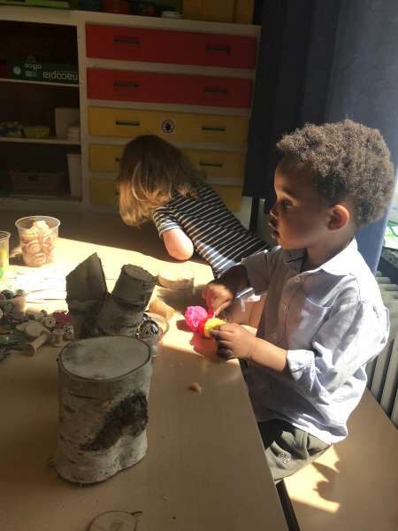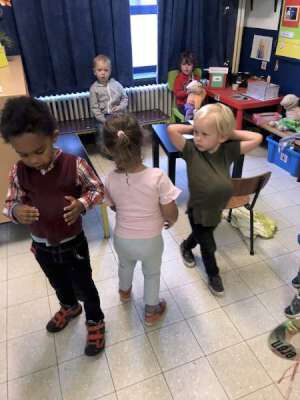 Op donderdag brengt de juf wat spulletjes mee van mama: een handtas, een sjaal, een portemonnee, een zonnebril, hoge hakke schoenen en kettingen. Treasure wordt een echte mama. We gaan verder met het versieren van een bloem en met het stempelen van bloemen met de achterkant van de fles. Dan luisteren we naar: Mama ik hou van jou. De spullen van mama leggen we in de poppenhoek. We stempelen hartjes in een groot hart en lezen het verhaal: Raad eens hoeveel ik van je hou voor.