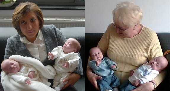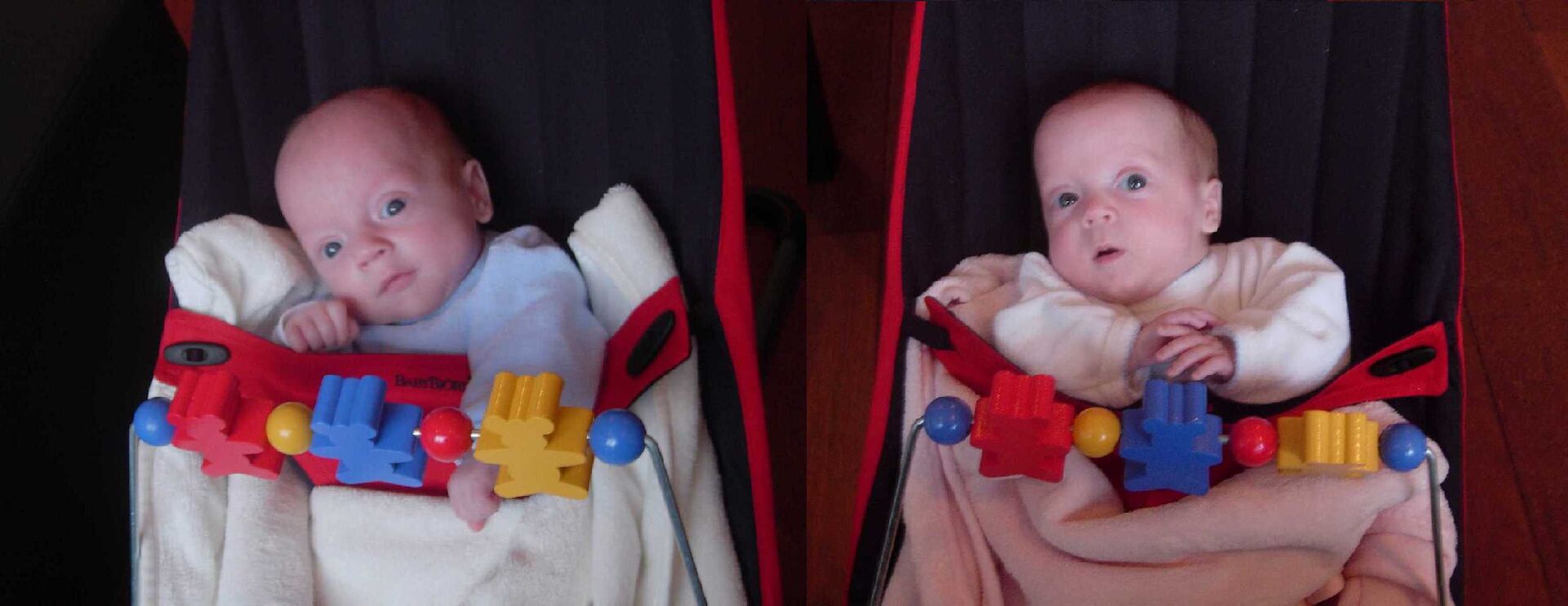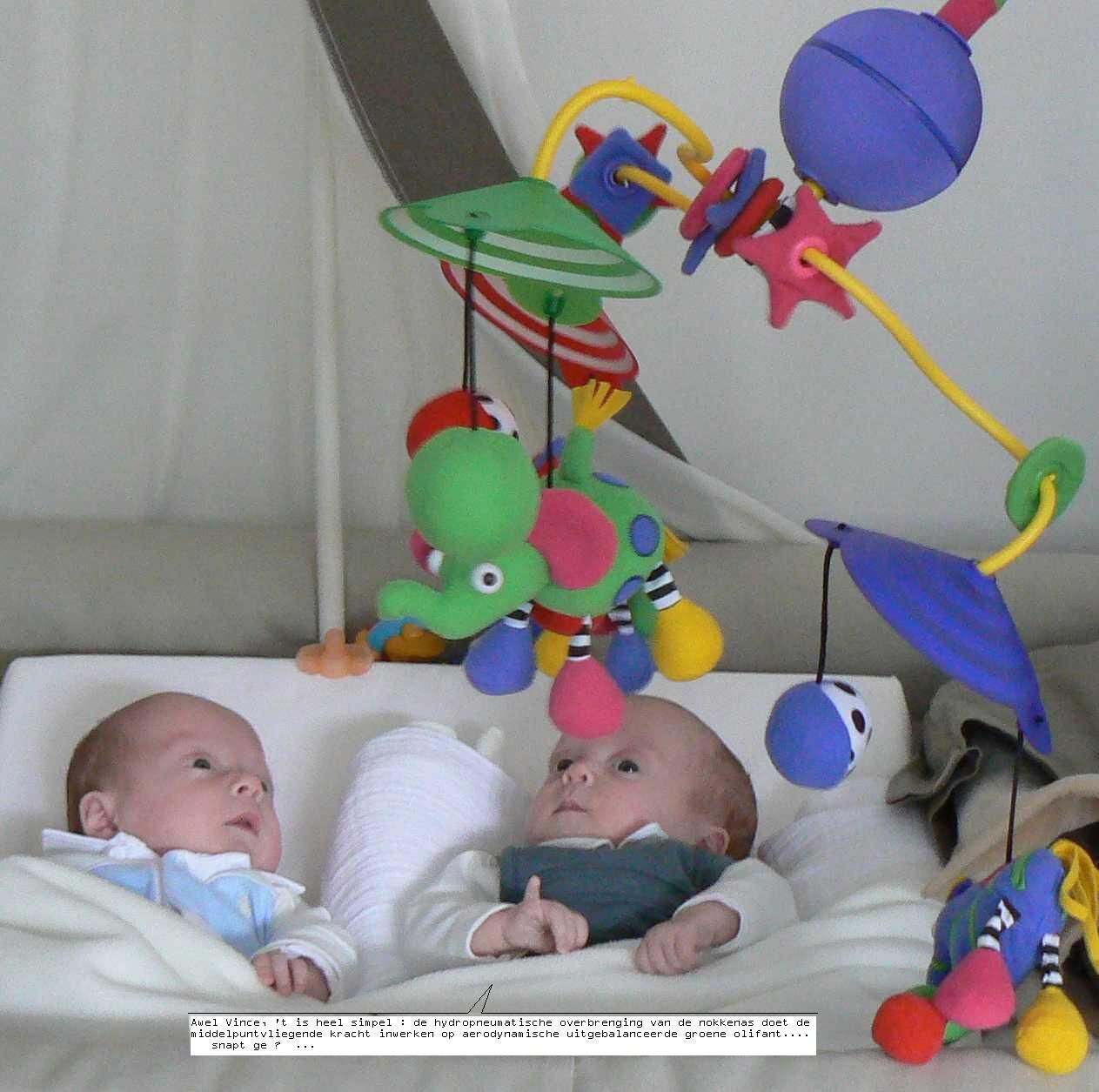 't Is al weer een hele tijd geleden maar dat komt door onze twee rakkers. Zij eisen al onze aandacht op en geven ons in return een degelijke groei-spurt. Op de maandelijkse controle bij Dr. Allegaert bleken Ella en Vince respectievelijk 3,510 Kg en 3,800 kg te wegen. Wat een voorruitgang ! Binnen enkele maanden is er van een achterstand totaal geen sprake meer. Zoals u op de foto kan zien is hun favoriete bezigheid momenteel "SPELEN". Alles wat een beetje kleur heeft wordt grondig afgetast. (Sandy)
