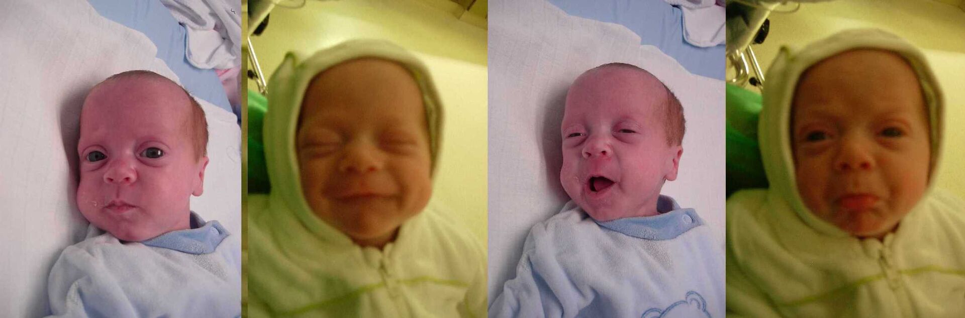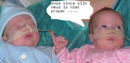 Halo, nog wat nieuws van op de dienst Neonatologie. Wij zijn supper-flink. Ik weet niet of je het al gezien heeft maar wij hebben geen zuurstof meer nodig. Dus onze zuurstofbuisje zijn uit onze neuzen. Wij drinken ook alle dagen onze flesjes tot op de bodem. Hierdoor hebben wij ook geen maagsondes meer via onze neuzen. Flink hé ? Het mooie gevolg van dit staaltje flink zijn is dat er ook geen plakkertjes meer op onze wangskes kleven. Tof hé ? Om U alles beter te laten zien zullen wij een paar gekke bekken trekken. (Ella & Vince)