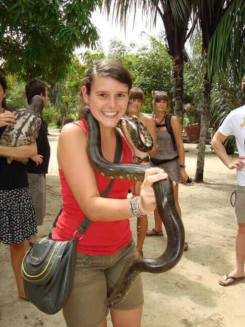De tweede dag gingen we samen met onze gids naar de zoo. Omstreeks 8uur moesten we opstaan en hebben we gezamenlijk ontbeten. Na het ontbijt zijn we vertrokken naar de dierentuin. Onderweg naar daar kwamen we het lokale schooltje tegen en zijn we deze als toekomstige leerkrachten natuurlijk gaan bezoeken. We merkte onmiddellijk dat deze school erg goed voorzien was en duidelijk veel materiaal had. We kregen een kleine rondleiding van de directrice. Toch zij ze ons dat alles wat stuk was of moest gerenoveerd worden allemaal via de school moest komen. Ze kregen geen subsidies. Daarom verkochten ze postkaarten gemaakt door de kinderen om zo geld te verzamelen. Nadien zijn we verder gegaan en kwamen we uiteindelijk aan bij de zoo. Onmiddellijk kregen we bezoek van enkele aapjes die ons rond de nek vlogen. Het was een unieke ervaring. Die dag hebben we een luiaard, vogelspin, schildpad en slang vastgehad. Achteraf gezien was het een super speciale ervaring. Die avond zijn we omstreeks 10uur naar de waterschildpadden gegaan. Het moest 's avonds omdat dan de schildpadden zich minder bedreigd voelen voor andere dieren waaronder de vogels enz. Ook dit was een speciale ervaring in de pikke donker in een bootje op een meer, aanmeren op een eilandje en wachten op een schildpad die haar eieren legt op het strand. Toch waren we verbaast over de omvang van zn dier. het dier legde ongeveer 150 a 200 eieren en zag eruit als een hard gekookt ei zonder schel.