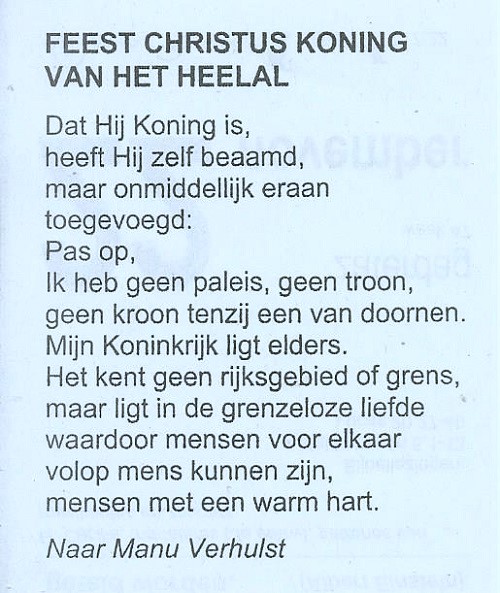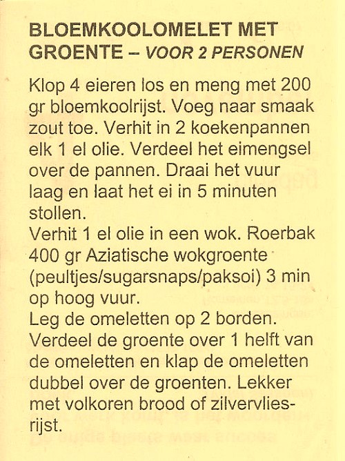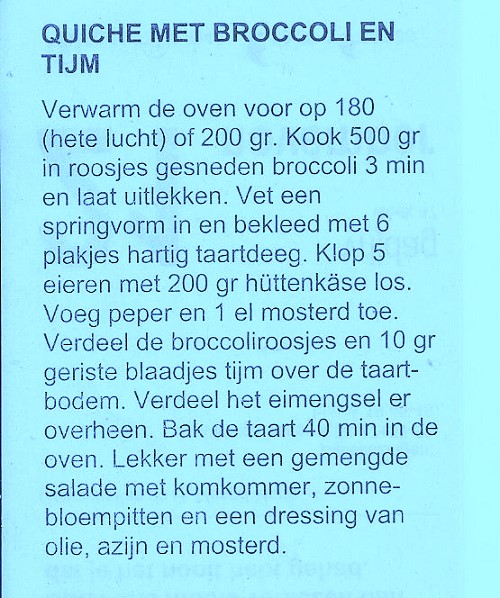 De recepten van vandaag zijn: Bloemkool Omelet met groente en een Quizgerecht  met Broccoli en Tijm in taartvorm. Vooraf werd me nog een vraag gesteld door een huishouding hier in de buurt waar de kinderen  'hap en sloek' aten voordat ze naar school gingen. Mijn advies is iets eerder opstaan, langzaam eten van een paar sneetjes tarwebrood met als beleg een gekookt en gepeld eitje en  wat ook aanbevelenswaardig is, dat is notenpasta!  Bij het ontbijt hoort ook een kopje groene of zwarte thee en als nagerecht een appeltje, peer of kiwi! Vandaag was het ook de dag van Christus Koning en ja wie denkt daar nog aan en eerlijk gezegd vergeet broeder Everard ook vaak van dergelijke katholieke feestdagen en dat komt allemaal door de moderne tijd  en met de stroom des tijds worden we allemaal  meegevoerd door de golfstromingen die aldoor maar slimmer worden en zelfs onze gedachtengang volgen!