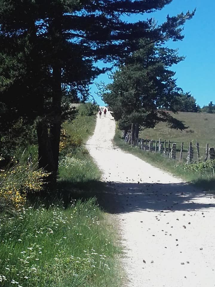 35 km wandelen in de weidse omgeving, door de weiden waar de Aubrac koeien razen, klimmen van 1050 m naar het hoogste punt van deze camino 1324 m ( Col d' Aubrac), het is zalig.