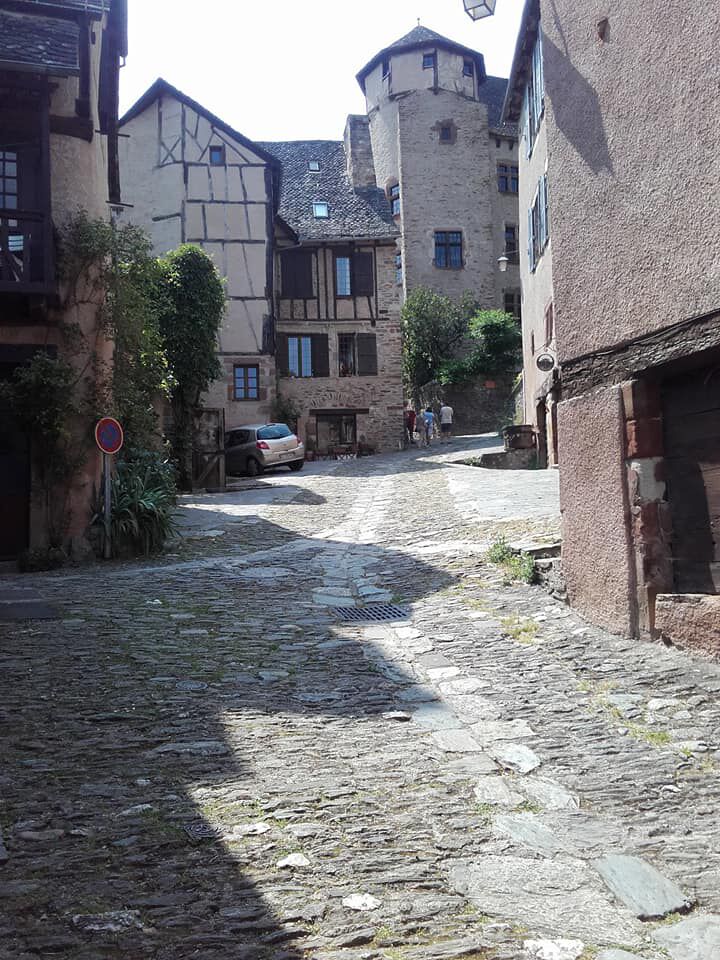 Na anderhalf uur en 8 km verder kom ik in Saint-Chely- d'Aubrac aan. Na een avontuurlijke afdaling in een bosrijke omgeving. Het is druk op de camino. Blijkbaar heeft de plaatselijke wandelclub zijn tweedaagse tocht rond de Monts d'Aubrac.