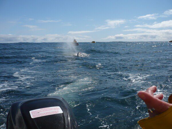 Belgische pannenkoeken deze morgen. Iedereen mocht een keer uitslapen, beetje chillen deze voormiddag. 's Middags vertrokken met de zodiacs voor de whalewatching. Na de nodige uitleg over de veiligheidsvoorschriften, het bekijken van een DVD over de onderwaterwereld van de walvissen, en het aantrekken van de nodige kledij, konden we vertrekken in 3 groepjes, met 3 zodiacs. Eenmaal op de open zee werd het steeds woeliger water. Op onze boot was Martijn de eerste, gevolgd door Jona, die de pancakes teruggaf aan de whales. Of misschien wouden ze de walvissen wel van heel dichtbij bekijken (!?). Waarschijnlijk vonden deze beesten onze belgische pancakes best lekker en werden ze hierdoor aangetrokken, want plots verschenen ze zelfs heel dicht achter onze boot. In alle jaren Canada heb ik deze dieren nooit zo dichtbij kunnen bewonderen. Net als gisteren bij het aanschouwen van de mastadonten van bomen in de regenwouden, voelde ik mezelf opnieuw heel nietig bij het zien van deze kolossen van walvissen. Net op tijd, en vooraleer iedereen zou beginnen kotsen, kwamen we aan bij de aanlegsteiger voor de hotsprings. Na een wandeling van een half uur door een prachtig bos, kwamen we bij de natuurlijke bassins. Het water borrelt er zo maar uit de grond, vormt uiteindelijk een beekje, en vloeit nadien naar de oceaan. Na het baden, terug op de boot. We zagen kolonnes zeeleeuwen, en een zee-otter zwaaide naar ons met zijn staart. Ook heel veel watervogels gespot en bald eagles. Schitterende dag. Perfect hoogtepunt, en één van de redenen waarom we naar Canada komen. Iedereen was vandaag zeer 'impressed' door deze wonderbaarlijke natuur, die nergens anders op aarde zo impressionant is. Ook ikzelf was (weeral) zwaar onder de indruk van deze omgeving.