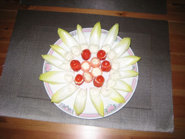 Het jaarovergang zijn we gaan vieren aan de caravan. Samen met vrienden, die achter onze caravan stonden. Erg leuk, want we moesten niet weg met de auto. Enkele aperitief hapjes, het voorgerecht en soep heb ik klaargemaakt. Dit waren de aperitief hapjes Witloof met Boursin en mini tomate crevette
