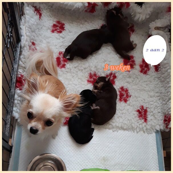 en de melk is heel goed op gang, mijn enigste zorg is dat de pupjes proper liggen en dat de mama's voldoende eten hebben. vanaf 4 weken wordt het intensief de zindelijkheidstraining en het slaap, eet en speel ritueel.