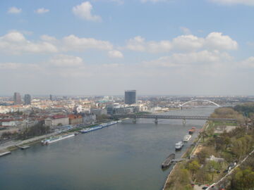 Thursday morning sleeping in ... a bit. Taking it easy, waiting for our lunch to arrive. Martha ordered food from where Laci works, something typical Hungarian. Steamed bread and white cabbage and pork, nice, sort of a stew. After that we took the car and drove to Bratislava. Lovely city, we saw it from high above first, from the top of the bridge, nice!