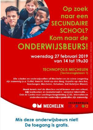 Vergeet ook niet in je agenda te noteren voor de jaarlijkse Onderwijsbeurs Secundair Onderwijs regio Mechelen, die doorgaat op woensdag 27 februari 2019 van 14u tot 19u30 in Technopolis.