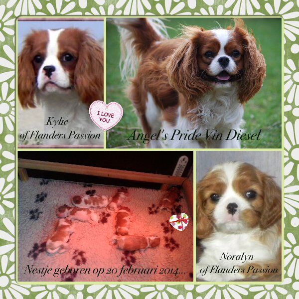 Nu vragen jullie zich waarschijnlijk af wie "Noralyn of Flanders Passion" is...?! Het voordeel van hondjes hebben (en dan in het bijzonder cavaliertjes) is dat je gemakkelijk contact legt met andere mensen die ook een cavaliertje hebben en/of hondenliefhebber zijn... Zo gaat het telkens weer als ik met Maggy & Noa ga wandelen ook... er gaat nauwelijks een wandeling voorbij of ik word aangesproken door voorbijgangers die vragen stellen als: Welk ras is het?, Zo'n mooie hondjes!!, Zijn het zusjes?,... Ik blijf het verbazend vinden hoe cavaliertjes met hun charme er telkens weer in slagen om mensen samen te brengen... maar ik geniet ervan met volle teugen en laat het dankbaar op mij afkomen... De kennismaking met Nicole is net iets anders verlopen... via mail eigenlijk en op de Pejatoyspa Clubwandeling hebben we elkaar eens ontmoet... maar laat ik bij het begin, beginnen... Nicole en haar man stonden op de wachtlijst vorig jaar bij Vera (Colours of Wales) maar omdat er geen pupjes beschikbaar waren, had Vera hen doorgestuurd naar Isalbelle Florée, een lieve dame uit Menen met de kennel "Of Flanders Crown"... Zij heeft zo nu en dan een nestje, het cavaliervirus heeft Isabelle vast met de paplepel mee gekregen want ook haar ouders hebben een kennel met de naam "Of Flanders Passion"... En het zijn Isabelle haar ouders die toen een zwanger teefje hadden... het was eventjes afwachten voor Nicole en haar man of er een teefje voor hen bij zou zijn... Op 20 februari 2014 was het dan zo ver... Mama Kylie "Of Flanders Passion" en papa Angel's Pride Vin Diesel (Benjamin) hadden samen een nestje van 7!! pupjes... en er was een teefje bij voor Nicole en haar man Het kleine meisje kreeg de naam "Noralyn" en zij heeft hun hartjes helemaal veroverd!! In de loop van het voorbije jaar hebben wij regelmatig gemaild en zo nu en dan zat er ook een mooie foto bij van Noralyntje en die heb ik allemaal netjes verzameld... Nu is Noralyn onlangs 1 jaar geworden en ik vroeg aan Nicole of ze het leuk zou vinden om Noralyn eens op het blog van onze cavjes te zien verschijnen? En dat vond ze een heel leuk idee en stuurde meteen wat info en nog wat extra foto's door... Zodoende... zien jullie eens een ander cavaliertje hier verschijnen Op de foto's zie je: de mama & papa van Noralyn, het nestje met haar broertjes en zusjes, Noralyn toen ze 8 weken jong was, Nicole en haar man en kleindochter en... natuurlijk fotootjes van Noralyn haar 1ste verjaardag !! Nicole... ik wens jullie nog heel veel plezier met jullie lieve, mooie meisje... geniet ervan en... tot een volgend mailtje,... Vele groetjes en een dikke knuffel voor Noralyn van ons allemaal!! xxx