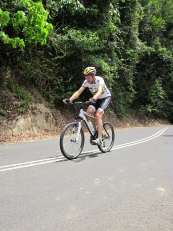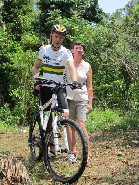 De eerste kilometers van de Crocodile voorbereid: de eerste asfaltklim valt mee, op naar het regenwoud waar de vogels om het hardst fluiten. De eerste echte klim off road is dan weer steil wat voor deze jongen loopwerk betekent !