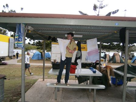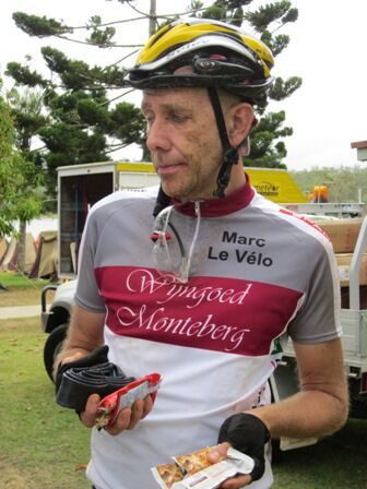 Vandaag voor het eerst echt aan het mountainbiken geweest: net na de start volgde een strook van goed 15km met vele rotsblokken, vele losliggende stenen, diepe geulen en voor velen dan ook vele platte banden. Een eindje met een Australiër gefietst, een Luxemburger en een Antwerpenaar. Eenmaal de eerste depot voorbij werd op een brede gravel baan gereden; De rode kleur deed me denken in Burkina Faso te zijn. Die tour is voor een andere keer. Eerst de Croco waar naar ik hoor nogal gekoerst wordt. Voor de tweede opeenvolgende keer wint Jeroen Boelens de rit. De jonge Nederlander had me gisteren een paar tips gegeven om mijn (geleende) pomp alsnog niet te verliezen: ducktape waardoor de pomp aan de binnenkant van het shirt plakt. Mijn support team haalde ondertussen een nieuw zadeltasje en een pomp. Nu maar hopen dat deze wat langer blijft hangen De volgende dagen moeten we meer en meer over corrugations : die rotdingen die je het gevoel geven over de kasseien van Wallers te rijden. Hier echter lopen de corrugations dwars over de weg het water en de wind trekt lange sleuven in de brede wegen. Het weer is momenteel goed in de streek waar we nu zijn,geen regen af en toe zon en warm. Gerda wacht nog steeds op Skippy: de dode die ze naast de weg vond telt niet mee !
