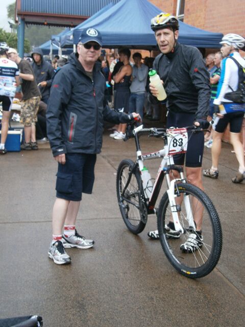 knieën) , rode aarde die door de regen mooie aan de kledij en de fiets kleefde