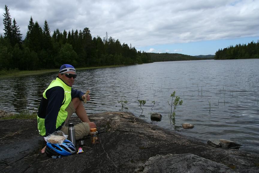 Aangenaam fietsweer vandaag, niet erg warm en wisselend bewolkt maar dus aangenaam om te fietsen. Trondheim heeft me gisteren nog een behoorlijk feestelijke verjaardag bezorgd, met op verscheidene plaatsen allerhande muziek en een gezellige drukte die een bijna zomerse sfeer had. Bij het verlaten van de stad heeft ze me echter even in de steek gelaten. De voorziene weg ging door een tunnel die verboden terein was voor fietsers en voetgangers, ze zeggen er dan wel niet bij hoe die aan de andere kant moeten geraken en als een mens dan de verkeerde optie neemt dan klimt hij enkele kilometers de berg op om die langs dezelfde weg weer af te komen om toch maar de andere optie te nemen. Eenmaal goed op weg ging het westelijk richting ferrie om de fjord over te steken en dezelfde fjord een stukje in oosrtelijke richting terug te volgen en zo dus na 2,5 uur eigenlijk Trondheim terug te passeren. Dan ging het landinwaarts en dus weer even klimmen. Nog even meegefietst met een Noorse wielertoerist (of hij met mij) die me in de beklimming inhaalde. Er wordt overigens, ondanks het terein, behoorlijk wat gefietst in Noorwegen. Misschien iets meer mountainbike maar ook de koersfiets kom je regelmatig tegen. De Noren zijn, gemiddeld genomen, best wel een aktief en outdoor volk. Bijna bovengekomen ging mijn weg dan rechts af (op de rustige Rv 720) om, eerst op enige afstand en een iets hoger gelegen weg, langs een grote meer. Schitterende uitzichten heb ik hier gehad. Daarna was het even dalen, waarbij ik een tijdje op gelijk niveau langs het meer ging en een erg mooi piknik plaatsje vond. Dan ging het een tijdje door een vallei verder naar beneden om bij een uitloper van een fjord uit te komen, 22 Km heb ik langs deze uitloper gefietst om bij de grote fjord uit te komen. Het nadeel van de rust op de Rv 720 is dat er ook geen campings langs liggen. Ik had gehoopt om wel iets tegen te komen maar negatief. Uiteindelijk kwam ik Follafoss waar een mooi voetbalveld lag met bijhorende kleedkamer. Even verder stonden enkele mannen een babbeltje te slaan en ik vroeg hen of zij de verantwoordelijke van het voetbalveld kenden om de vragen om er te kamperen en gebruik te mogen maken van de toiletten. Ze verwezen mij echter door naar een kleine "marina" waar ik een toilet, water en zowaar een stopcontact vond. En zo verblijf ik dus vanavond op mijn eerste "niet officiele" camping en ben ik dus nog eens met mijn campingbrander bezig. Km vandaag: 106 Km totaal: 2749 Ik beloof dat de volgende ritten terug korter zullen zijn, daar zijn ook meer faciliteiten.