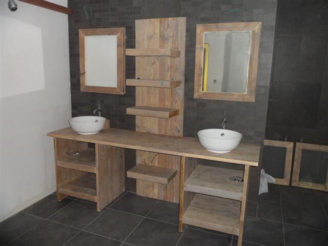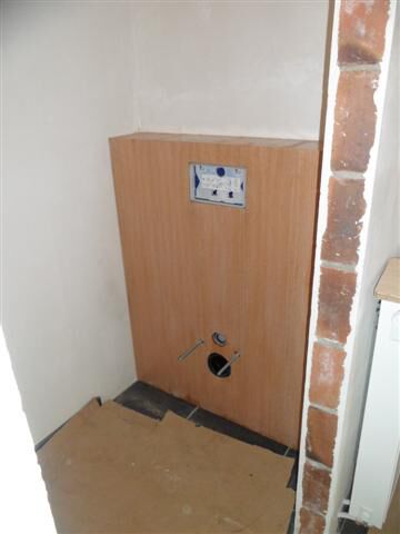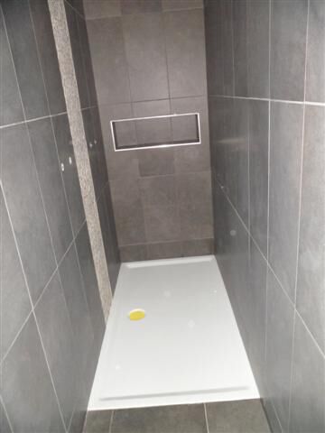 De badkamer is al wel geverfd in primer. De wand waar de schuifdeur in schuift, moet nog worden afgewerkt (gaten dicht gemaakt) en geverfd. De shuifdeur krijgt dezelfde kleur als die muur. De muren moeten ook nog een kleur krijgen. We weten nog niet de welke. In het niske in de douche komt ook nog indirecte verlichting