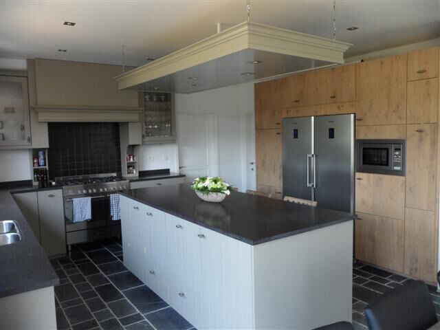 Onze keuken, eindelijk af! De omkasting van de dampkap en de lichtbak boven het eiland heeft onze papa zelf gemaakt. We hadden dan bij de keukenhandelaar verf besteld om deze zelf in de kleur van de keuken te verven. Maar nu reageerde die verf op de primer. Met gevolg dat de verf open barstte en schilferde. Het was dus niet de juiste verf om dit zo te doen. Nu heeft Kristof alles terug moeten afschuren tot op het hout en heb ik weer alles moeten verven in primer en dan in de juiste verf. We hadden dan toch andere verf gekregen van de keukenhandelaar. Nu zijn wel héél tevreden met het resultaat. Waar het houten bankje staat, moet later de speelhoek van de kinderen worden.