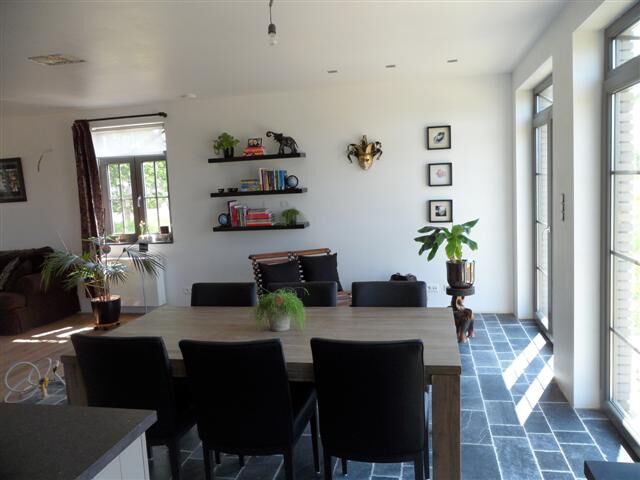 De eetkamer is een aparte ruimte. Dit hebben we bewust zo gedaan. Als je in de hal staat kan je door de dubbel deur naar de eetkamer. Deze grenst ook aan de keuken. De eetkamer is wel in primer geverfd. Maar moet ook nog een kleur krijgen. (geen oranje, want dat ben ik ondertussen kotsbeu gezien )